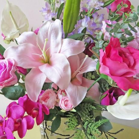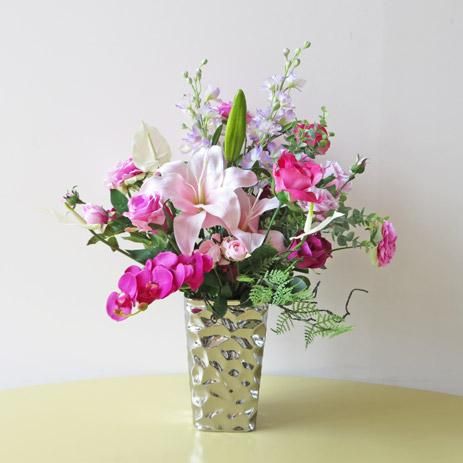 光触媒アートフラワーアレンジメント【レンク】メタリックな花器に、明るめに高級造花をアレンジしました。大輪のリリーが素敵です