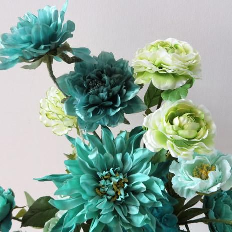 花材は、ダリア、ピオニー、ハイドレンジア、ラナンキュラス、ローズ等です。「アート感」重視のお花なので、リアルではありませんが圧倒的な個性で人気の花々です。花器の色彩とともに、個性が際立っています。光触媒加工品なのでホコリが付きにくくキレイが続きますから、安心です。