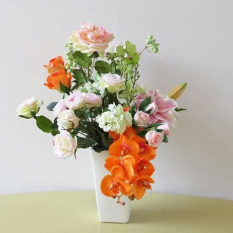 ばらの色彩・形も結構いけてます。さすがアーティフィシャルフラワー(高級造花)だけあって、造形がいいです。オレンジの胡蝶蘭は、華やかさっていうのでしょうか、かなり目に飛び込んできます。花器は、陶器製です。華やかさと優美さがある高級造花アレンジです。光触媒加工品なのでホコリが付きにくく、綺麗が長く続きます。インテリアとしてどうぞ。