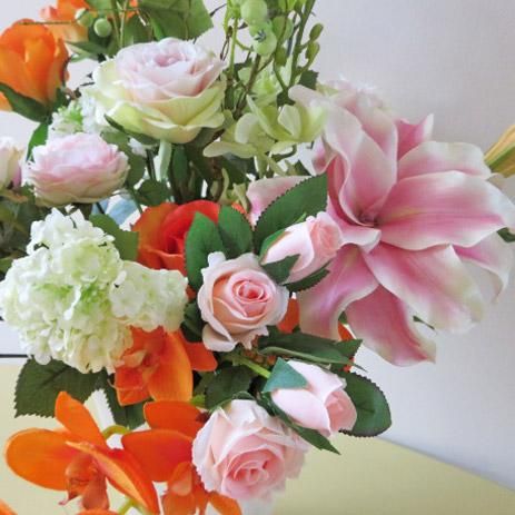 光触媒アートフラワーアレンジメント【エクリール】オレンジと薄ピンクの花々の優美なアレンジです。コチョウランと八重咲きリリーのインパクトに納得