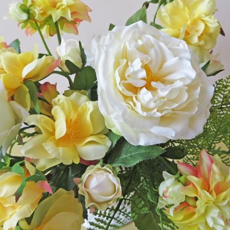 光触媒加工された造花のアレンジメントです。アーティフィシャルフラワー(高級造花)のローズの良さが際立ちます。黄色は、開店祝いや開院祝いに人気です。贈りものにいかがでしょうか。