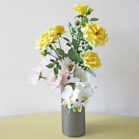 パールグレーの花器を使用しています。バラ・胡蝶蘭・セルリアを淡い仕上がりにまとめました。場所を選ばずどこに飾っても馴染んでくれそうです。ご長寿祝いにおすすめですよ。