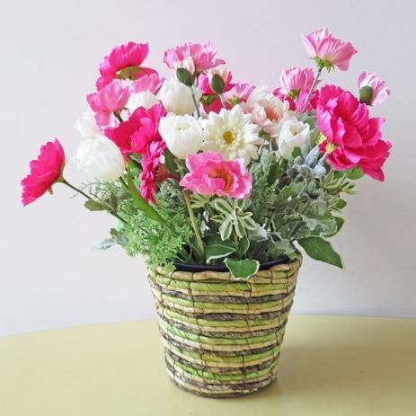 ポピー・チューリップ・ガーベラ使ったポップなアレンジです。ボリュームがありますが、花器はカゴを使用していますので、持ち運びカンタン。倒して割れる心配もありません。