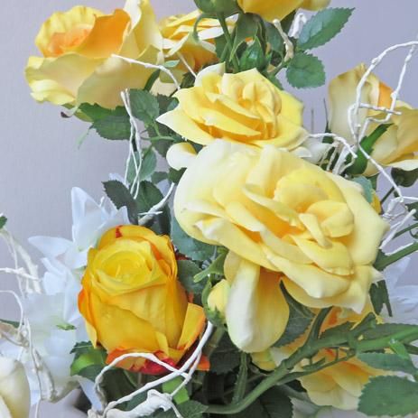 よく見ると、3種類の黄色いバラを使用しています。花びらに少し赤色が混ざったバラもあり単調になっていません。開店祝いやご長寿のお祝いにも。