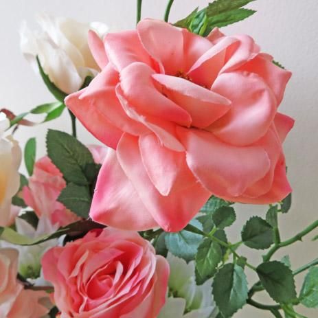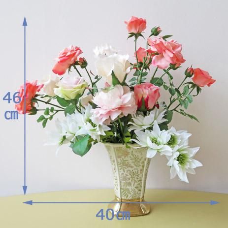 4種類のバラと、ラナンキュラス、セルリアの造花アレンジメントです。華やかさの中にしっとり落ち着くような上品さがあります。