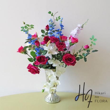 光触媒アートフラワーアレンジメント【マルテス】ビューティー色の伸びやかな枝を持つバラとデルフィニウムの高級造花アレンジです。