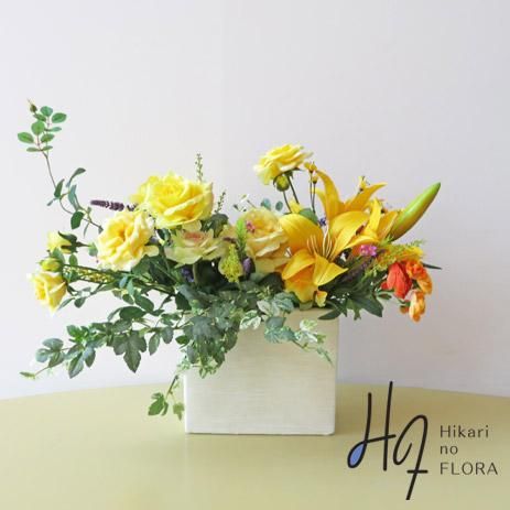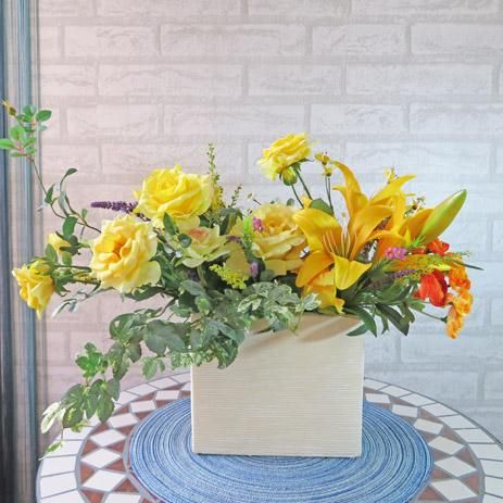 光触媒アートフラワーアレンジメント【アルタ】明るい、陽気、楽しい、幸福をイメージする黄色いアレンジは開店祝い・開院祝いにおすすめです。