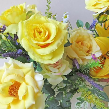 花材は、6種のバラとリリー、ラナンキュラス、そしてたくさんの小花たちです。同じ黄色系でも、それぞれのお花の顔が違うので、とても豪華です。花器は、刷毛目調の陶器製です。