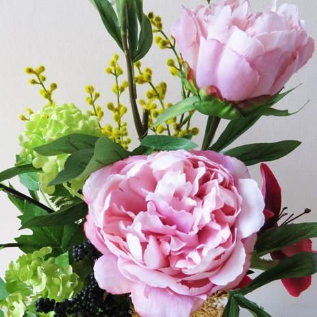 ピオニー・リリー・ミモザなどを使いました。和洋どちらの雰囲気にも馴染む仕上がりです。