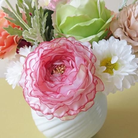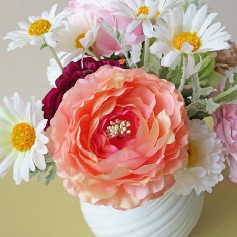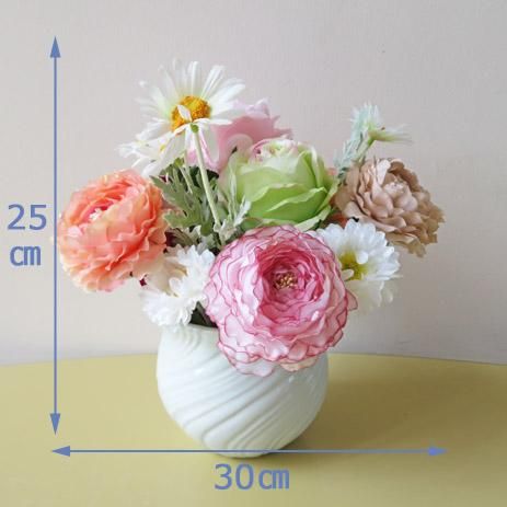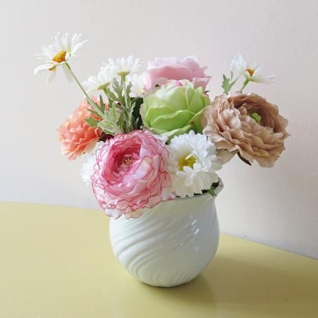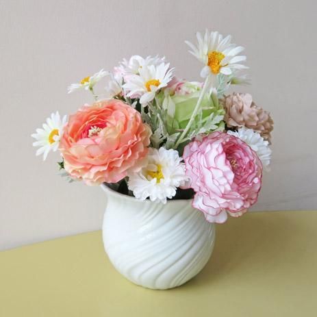 まん丸の花器にまん丸のラナンキュラス、そしてデージーとガーベラなどを入れた、人気の高級造花アレンジです。