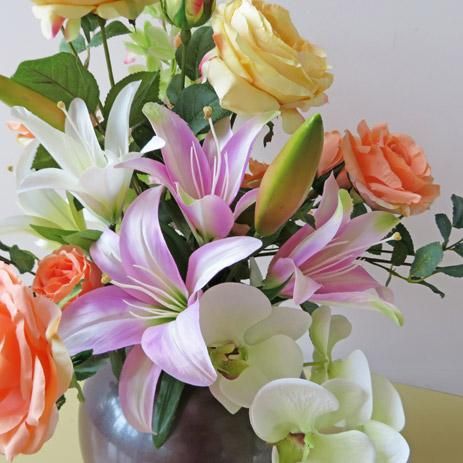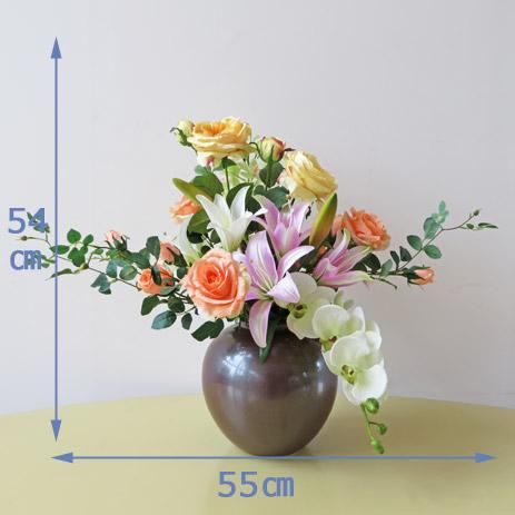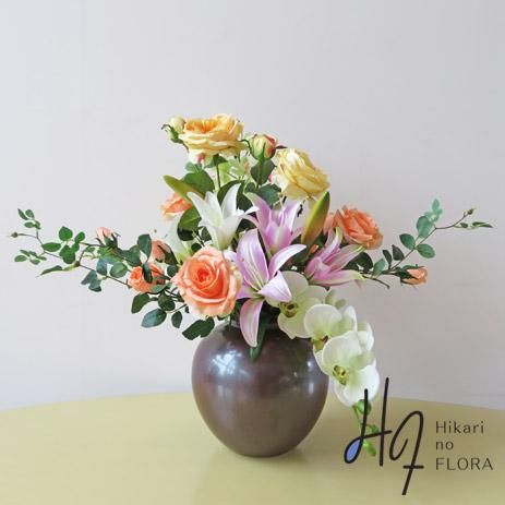 伸びやかに、そして零れるように花々が咲きます。花材は、胡蝶蘭、シンビジューム、リリー、ローズなどです。花器は、九谷焼産地サビ釉薬仕上花生です。落ち着いた中にも、豪華さがあります。光触媒加工品なのでホコリが付きにくく、インテリアとして長く飾れます。