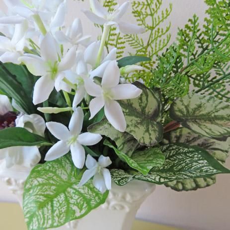 白色のアネモネ、ジャスミンがグリーンの中で映えます。さわやかな風景を思い浮かべます。心が洗われるような、高級造花アレンジです。光触媒加工品なので抗菌性が高く、キレイが続きます。
