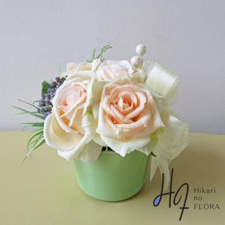 優しい色彩のローズのアレンジです。贈り物にいかがでしょうか。花器は、陶器製です。光触媒加工品なのでホコリがつきにくく、キレイが続きます。