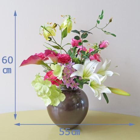 個性的なハイドレンジアと色彩の綺麗なカラー、リリー、ラナンキュラス、グロリオサ、シンビジューム、ローズなどです。花器は、七寸のサビ釉薬仕上です。光触媒加工品なのでホコリが付きにくく、キレイが続きます。