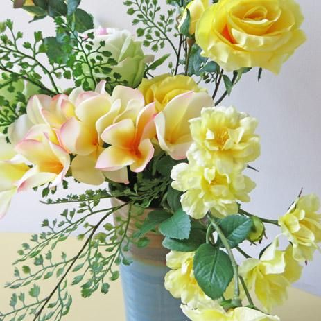 造花インテリア【プルメリア】プルメリアとローズのアレンジです。海をイメージできる花器に入れてみました。リョクエイからの、メルヘンチックなご提案です。