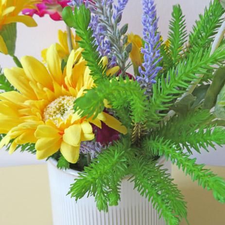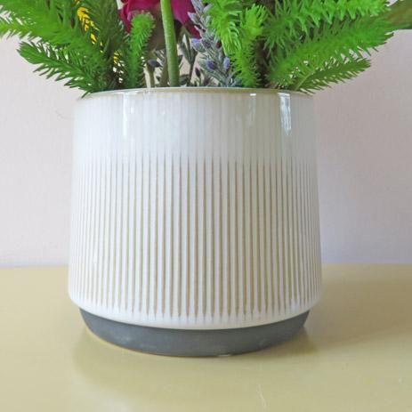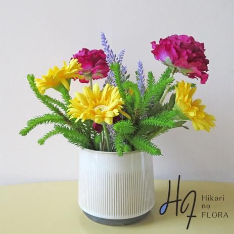 「パイン」のみずみずしさとグリーンの生命感、生命力みたいなものが、伝わってきます。「松」ということだけでも、「縁起の良さ」みたいなことを連想しますよね。花材は、ラナンキュラスとガーベラとラベンダーとパインです。花器は、国内トップメーカーの品で、「vertical(バーティカル)」といいます。縦ラインの細かいレリーフが特徴の、北欧テイストなアレンジベース。艶のある白と、マットなグレーの釉薬の組み合わせが特徴の花器です。