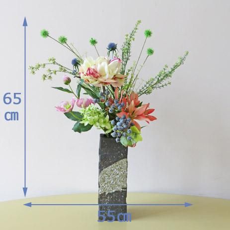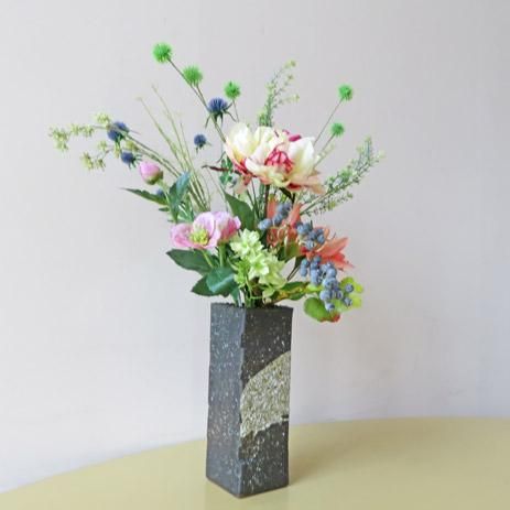 信楽焼の花器に、ニューモダンな感じでアレンジしてみました。造花インテリアとしてご利用いただきたいですね。光触媒加工品なのでホコリが付きにくく、キレイが続きます。