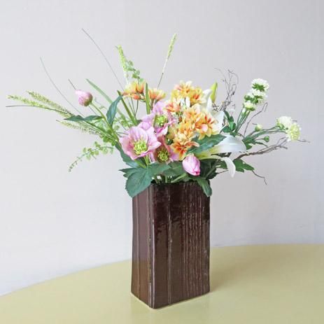 山野草ファンに大人気の「レウィシア」のを使用しました。ガーデニングでも近頃見かけるようになりました。今回は、ツイッグや山百合、野菊やオシャレな草場も入れて、ナチュラル感を出してアレンジしてみました。薄っぺらな造花とは違う、ワンランク上の花材をお楽しみください。花器は、「布のテスクチャを張り付け、そのまま型取りした」クラフト感のあるモダンな陶器製です。