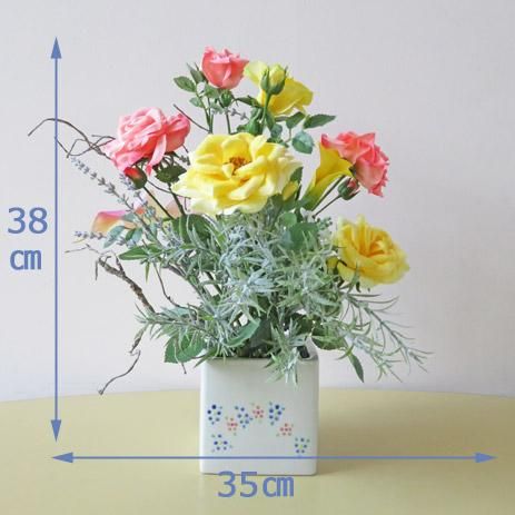 色彩が素敵なローズをブッシュと絡ませてアレンジしました。花器も、可愛いですよね。光触媒加工品なのでホコリが付きにくくキレイが続きます。