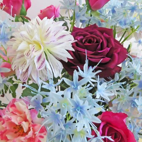 高級造花アレンジメント【デーリア】バキアを入れることでピンク感をより強調しました。素敵な6種のバラも見所です。