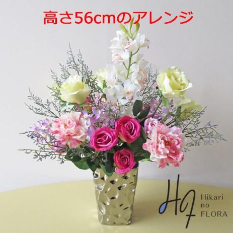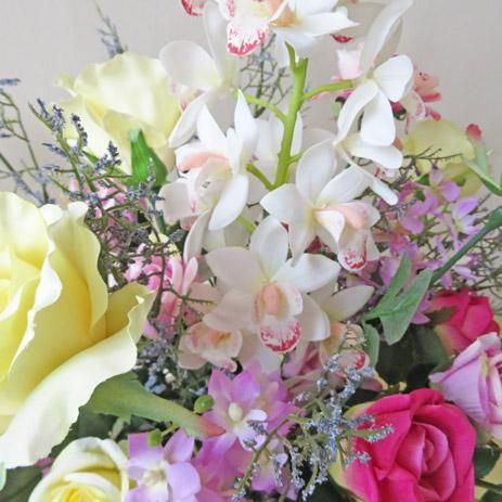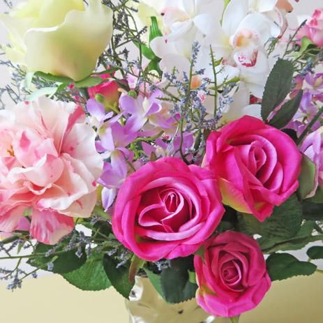 ローズとシンビジュームの上品な高級造花アレンジです。メタリックな花器と相まって個性的ながらどこか安定感のあるアレンジです。万人受けする安定感でしょうか。光触媒加工品なのでホコリが付きにくく綺麗が、続きます。