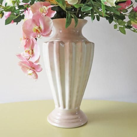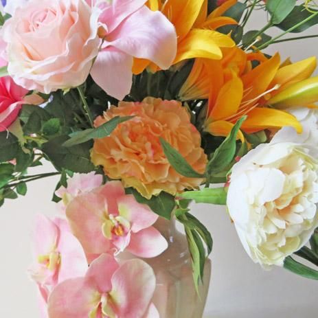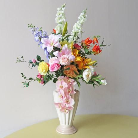 花材は、リアルで優美な人気のコチョウラン、六種の個性的なローズ、二種のデルフィニューム、、二種のリリー(カサブランカ)、二種のピオニー、グロリオサ、ダリア等です。花器は、高さ45cm、最大幅23cm、底直径18cmです。和らな色彩で優美な姿が印象的な高級造花アレンジメントです。カサブランカリリーと胡蝶蘭のピンクを、周りの花々が引き立てます。「リアル感やアート感」が圧倒します。エントランスやロビー、応接室などにいかがでしょうか。