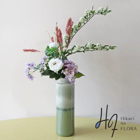 コデマリを使用しました。お花の並びが綺麗なコデマリは、和風感もあって人気のお花です。花器は、竹をイメージさせる陶器製花器です。和風モダンな造花インテリアです。光触媒加工品なのでホコリが付きにくくキレイが続きます。