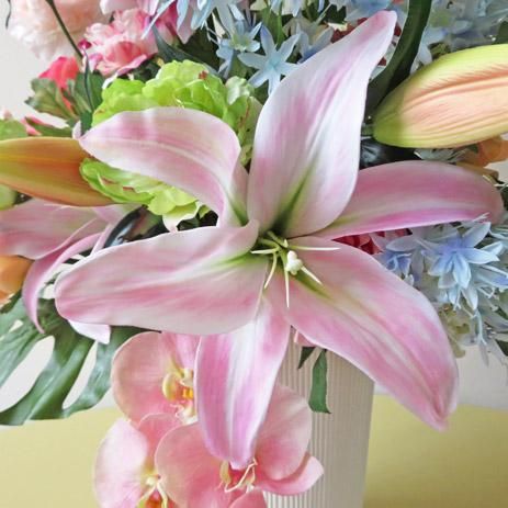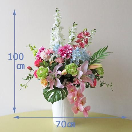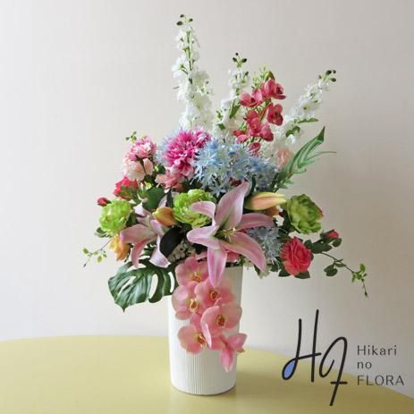 大輪のカサブランカリリーやリアルな胡蝶蘭など、優美な花々を集めてアレンジしました。花材は、シンビジューム、カサブランカリリー、ダリア、ラナンキュラス、アネモネ、デルフィニウム、アネモネ、ピオニー、ダイヤモンドリリー、モンステラなどです。光触媒加工品なのでホコリが付きにくく、キレイがつづきます。