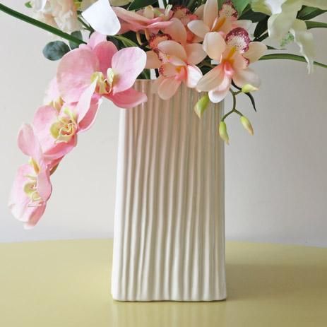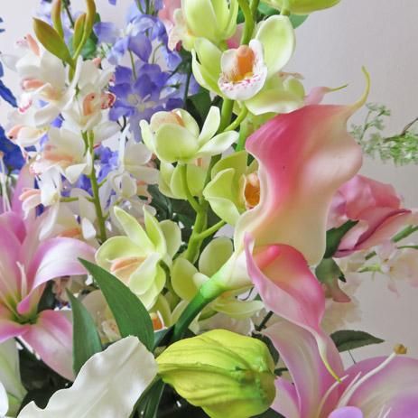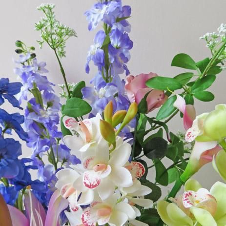花材は、3種のリリーと3種のシンビジューム、2種のデルフィニウム、コチョウラン、ローズ、カラーなどです。光触媒加工品なのでホコリが付きにくく、キレイが続きます。