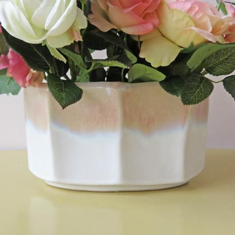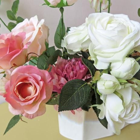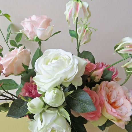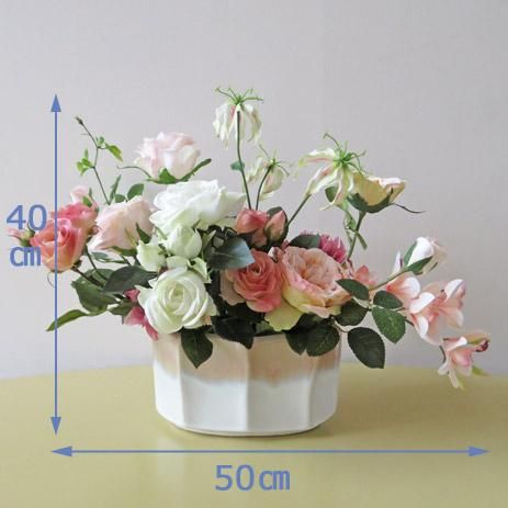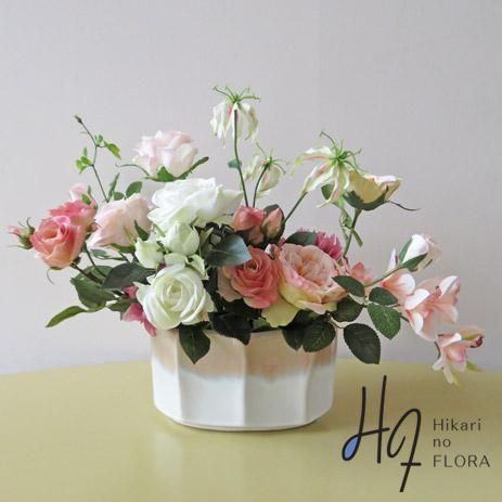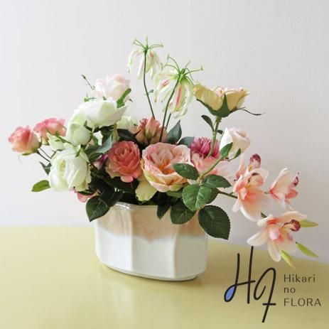 花材は、4種のローズ、グロリオサ、シンビジューム、ピオニーなどです。花器は、ペールトーンのグラデーションで少しフェミニンなモダンテイスト。「大人の上品さ」がうかがえます。光触媒加工品なのでホコリが付きにくく、キレイが続きます。