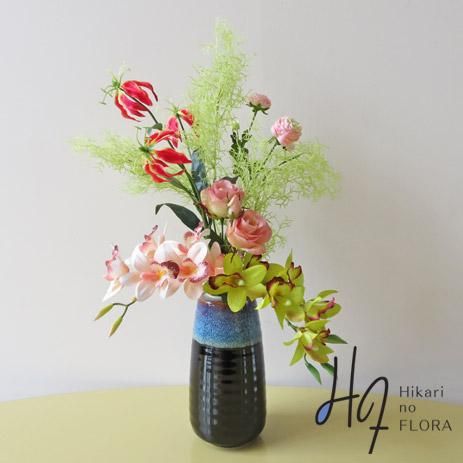 花材は、ウォーターグラス、グロリオサ、シンビジューム、ラナンキュラス、ローズなどです。花器は、美濃焼です。光触媒加工品なのでホコリが付きにくく、キレイが続きます。