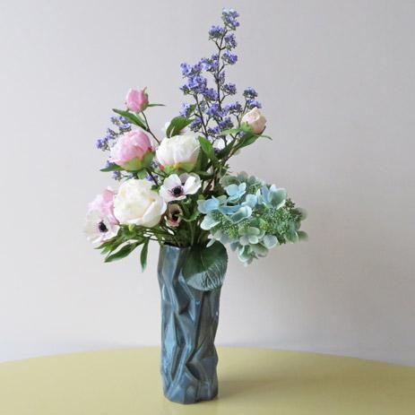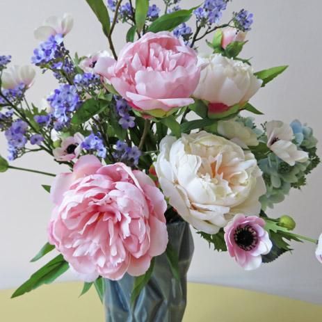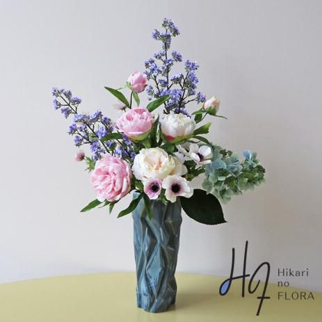 美しい小花をトップに、ピオニーをツインにしてハイドレンジアとアネモネの小花を添えました。花器は、個性的な形状で高級感があります。光触媒加工品なのでホコリが付きにくく、キレイが続きます。