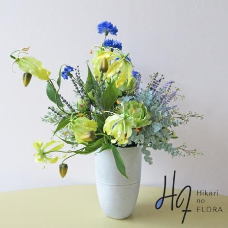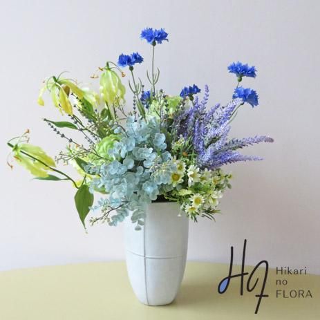 花材は、ラベンダーブッシュ、ユーカリ、コーンフラワー、ピオニー、グロリオサなどです。花器は、シンプルでありながら、表面に変化が現れる釉薬を使用し、奥行のある仕上げになっています。より釉薬の美しさが際立つラインも特徴です。光触媒加工品なのでホコリが付きにくく、キレイが続きます。