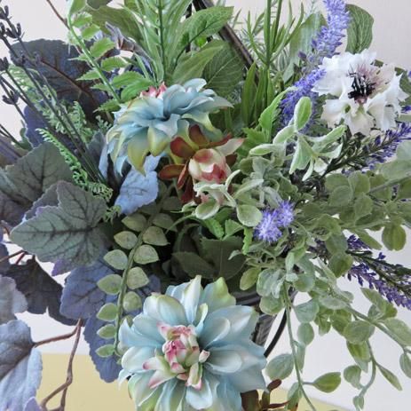 ブッシュの色合いとラベンダーが合います。個性的なアレンジの中に、高級感を感じさせる色合いを感じます。光触媒加工品なのでホコリが付きにくく、綺麗が続きます。