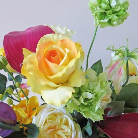 花材は、ローズ、グロリオサ、ラナンキュラス、アンスリウム、モカラなどです。光触媒加工品なのでホコリが付きにくく、キレイが続きます。