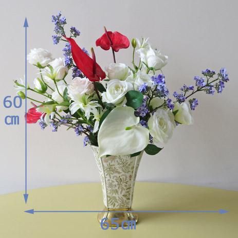 高級造花アレンジメント【ベニアミーナ】八寸サビ釉薬カメ花瓶に咲き誇る花々を生き生きとアレンジしました。