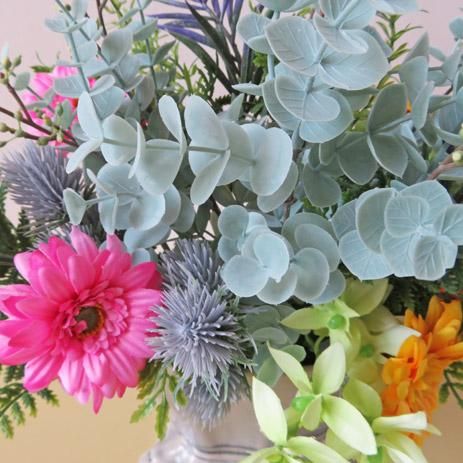 ナチュラルな葉物の中で、ガーベラが明るさを演出します。水を与えてしまいそうなナチュラル感です。花器は、繊細なドレープのラインとシックなグレーがエレガントな脚付きベース。クラシカルな中にフェミニンさを感じさせます。光触媒加工品なのでホコリが付きにくくキレイが続きます。