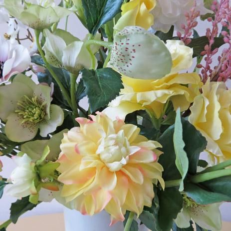 高級造花アレンジメント【シティオ】イエローの中に薄ピンクのアネモネとアスチルベをアクセントにしました。