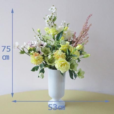 美しい黄色のダリア、ローズ、トルコギキョウの中で薄ピンクのアネモネが映える高級造花アレンジメントです。花器は、国内トップメーカーのヨーロッパのアンティークの鋳物に着想を得た、レリーフの無いシンプルでクラシカルな器です。黒土と白釉薬の組み合わせが、上質感と優しい質感を出します。光触媒加工品なのでホコリが付きにくくキレイが続きます。