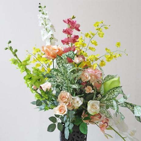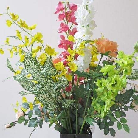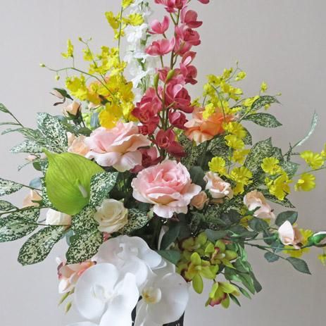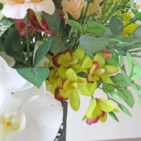光触媒造花アレンジメント【スタンド70型RD502】12種の花々が綺麗です。オンシジュームのイエローとシンビジュームが艶やかです。