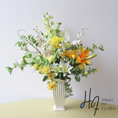 高級造花アレンジメント【フェア】開店祝いや新築祝い、移転祝いなどに人気のイエロー色が主役の高級造花アレンジメントです。