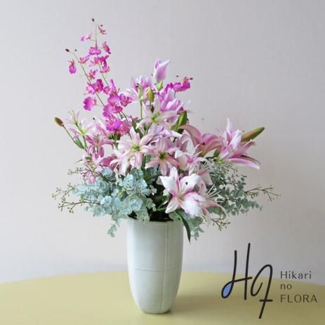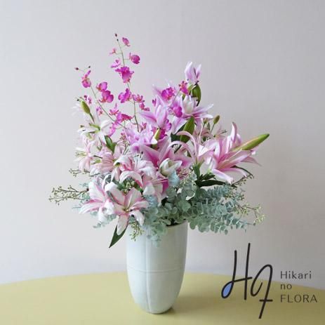 カラーセラピーでは「ピンクは、気持を穏やかにする色」とされています。リリーでまとめてみました。それに人気のユーカリを挿して柔らかさを出しました。花器は、陶器製です。光触媒加工品なのでホコリが付きにくくキレイが、長く続きます。