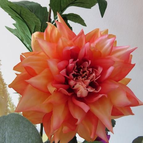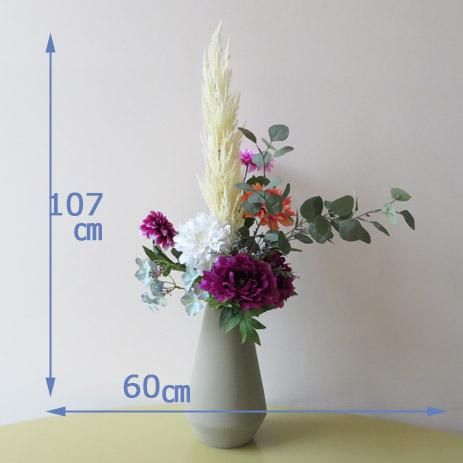 高さ107cmの大型アレンジメントです。花材は、大型パンパス、4種のダリアとピオニー、ハイドレンジアなどです。ひとつひとつのお花を楽しめます。花器は、高級感あふれる陶器製です。
