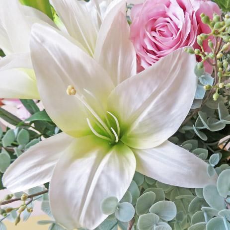 オシャレなユーカリとリリィー、ローズが伸びやかにアレンジされています。フォルムも個性的で美しさと気品があります。花器は、ゴールドやシルーバーの脚元がすてきです。