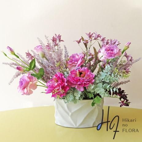 高級造花アレンジメント【レイラ】個性的なラナンキュラスとブロッサムが素敵な、高級造花アレンジメントです。
