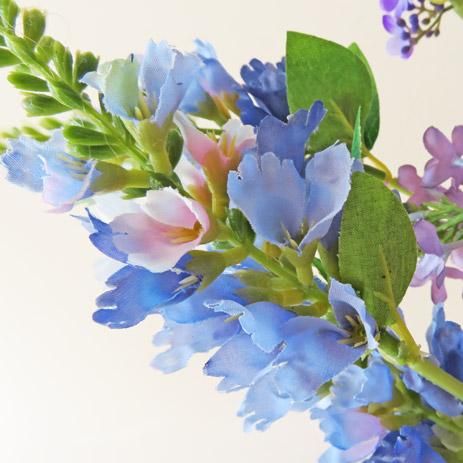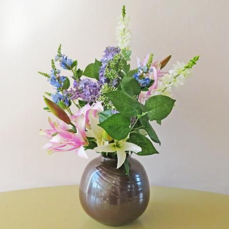 高級造花アレンジメント【ダーリヤ】七.五寸サビ釉薬花生に国内最高クラスのライラックやヒソップを入れて、ナチュラルに和風感を演出しました。