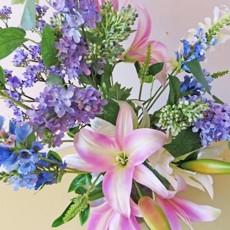 和風感漂う九谷焼産地のサビ釉薬の花器に、ライラック、ヒソップ、トラノオ、小枝、リリーを入れました。和風モダンのインテリアとして、ご利用ください。高品質な花材で贈り物にされても、安心です。きっと喜ばれます。
