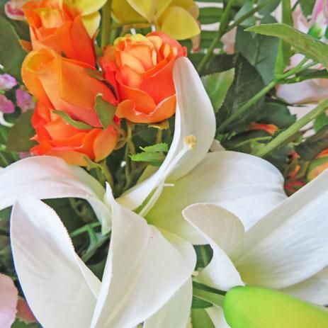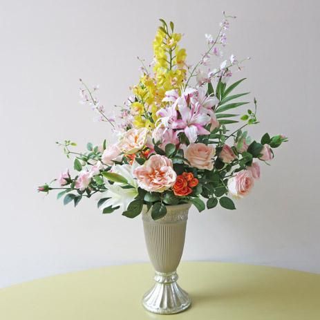 リアルなシンビジュームやリリー、可愛い色彩のオンシジュームなど見所がいっぱい!優しく上品にアレンジされています。高級造花の世界をどうぞ。花器は、伝統的なヨーロピアンスタイルの花器です。