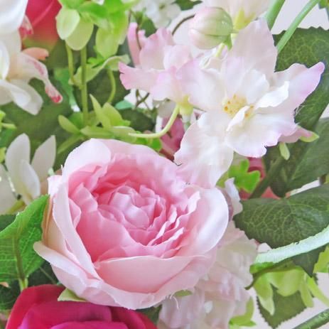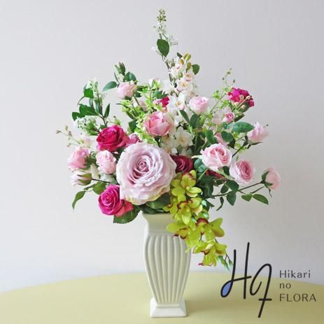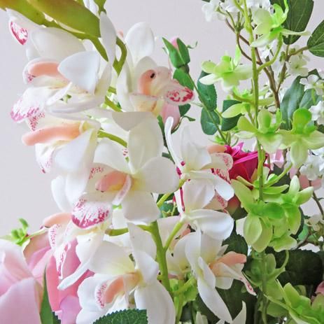 バラとシンビジューム、そしてジャスミンの枝。ピンクのバラが優美な高級造花アレンジメントです。