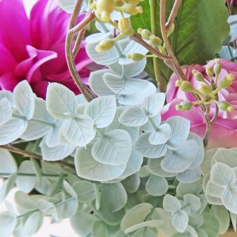 この色彩を活かす空間はどこでしょうか。とっても素敵な高級造花です。花材は、ダリア、ローズ、アンスリウム、ベロニカ、ユーカリなどです。花器は、国内トップメーカーの人気花器です。